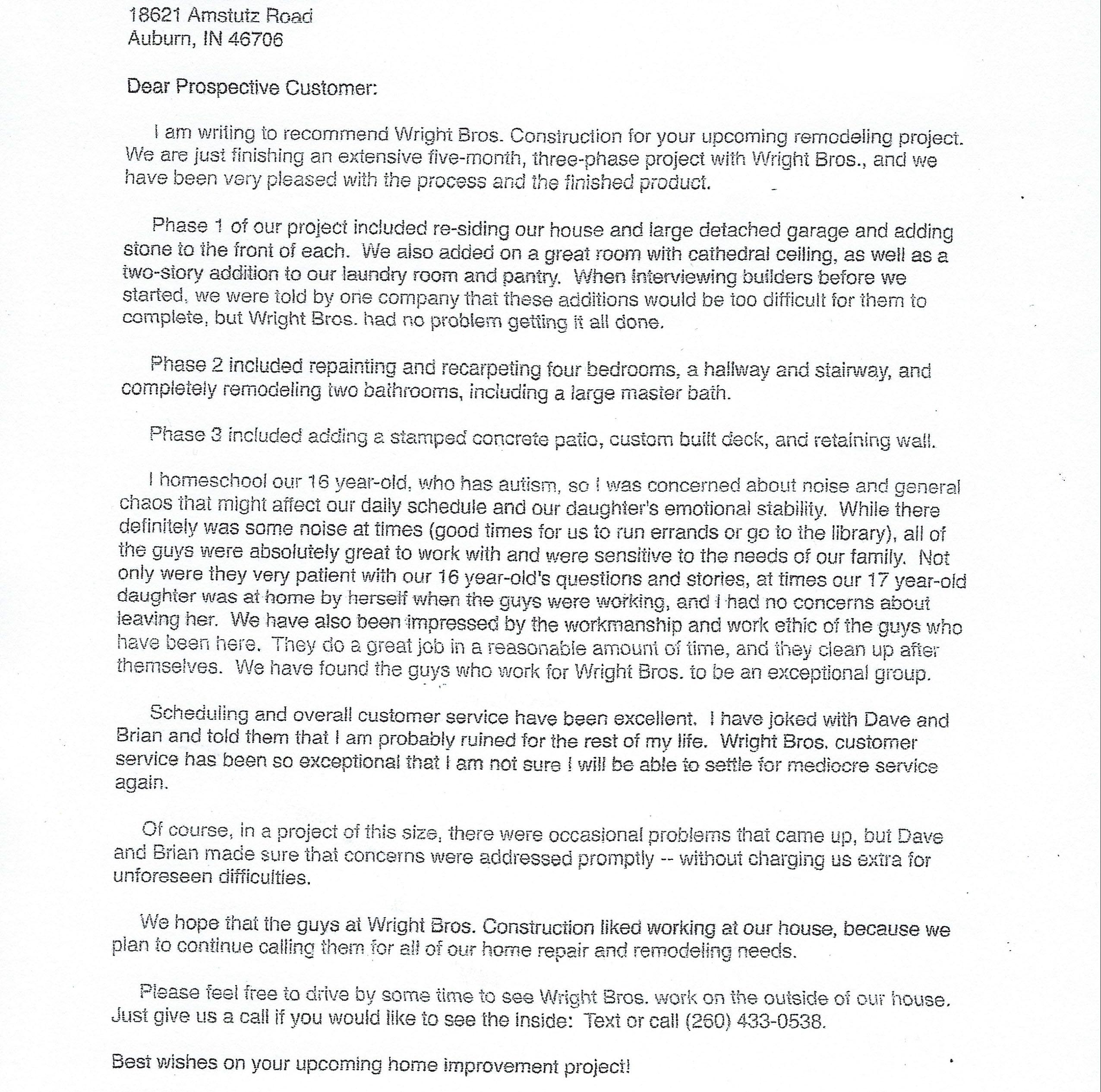 “Scheduling and overall customer service have been excellent. I have Joked with Dave and Brian and told them that I am probably ruined for the rest of my life. Wright Bros. customer service has been so exceptional that I am not sure I will be able to settle for mediocre service again.” Sue